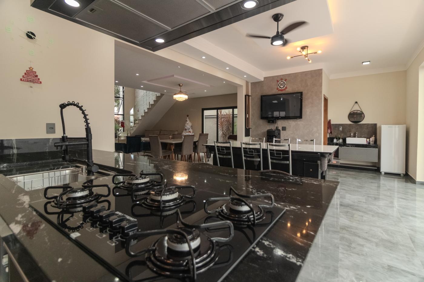 Ao entrar na casa, você é recebido por três salas espaçosas que podem ser adaptadas conforme suas necessidades e preferências. Seja para momentos de lazer com amigos ou reuniões familiares, esses ambientes versáteis atendem perfeitamente ao seu estilo de vida. A cozinha é um verdadeiro convite à gastronomia, equipada com móveis planejados que oferecem praticidade e organização. Além disso, a copa e a àrea gourmet integradas tornam as refeições do dia a dia ainda e das datas especiais, ainda mais agradáveis.